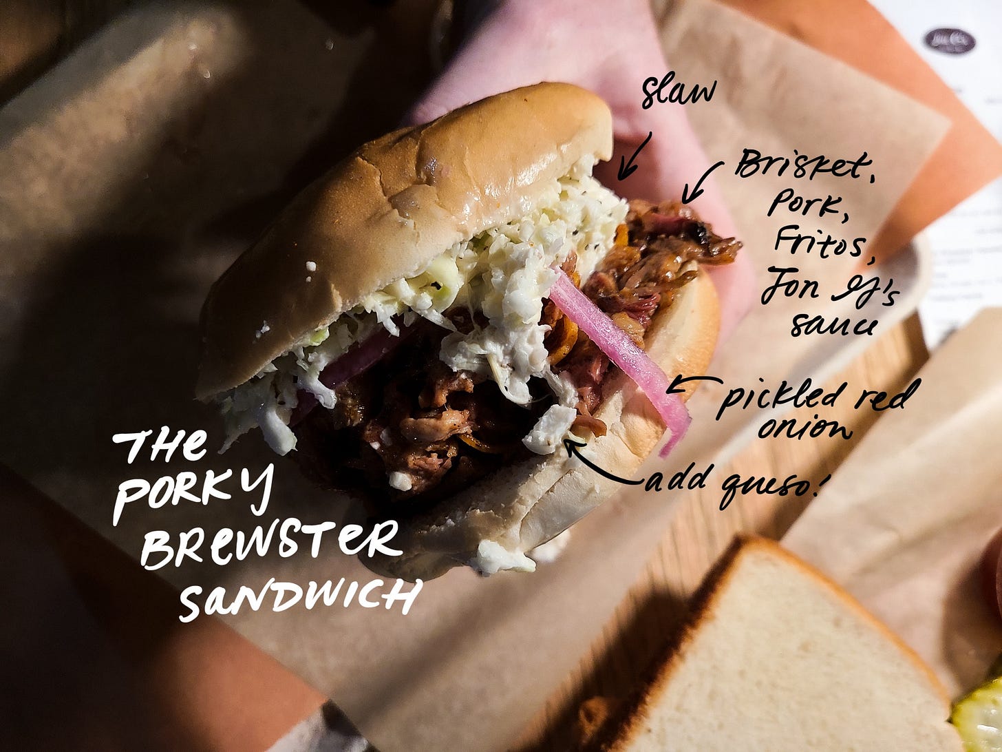This sandwich was insane; I loved the brisket + pork combination, and the Jon G’s sauce is the rare barbecue sauce that I’ve enjoyed (normally BBQ sauce is too sweet for me and feels artificial; this one has a lot of spice and flavor!). The slaw and the queso worked well with the flavorful meat; mellowing out the profile and countering the spice at just the right amount. The house-made candied jalapeños were the best I’ve ever had (a great mix of spicy-sweet, not too hot and not too candied). (rating: 10/10)