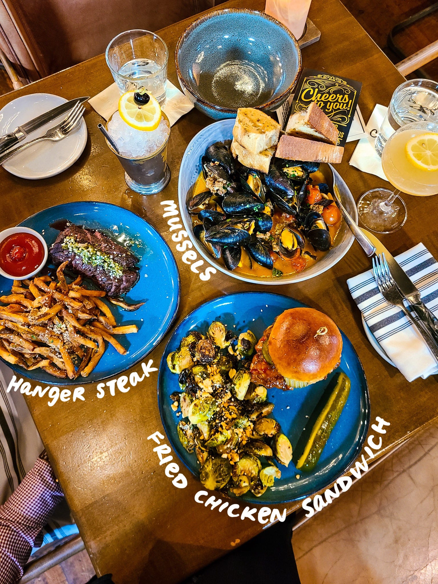 entrées: french onion soup, variety of salads, burger, fried chicken sandwich, chicken piccata, pork shank, hanger steak, scallops & shrimp pasta, Tomahawk steak, etc.