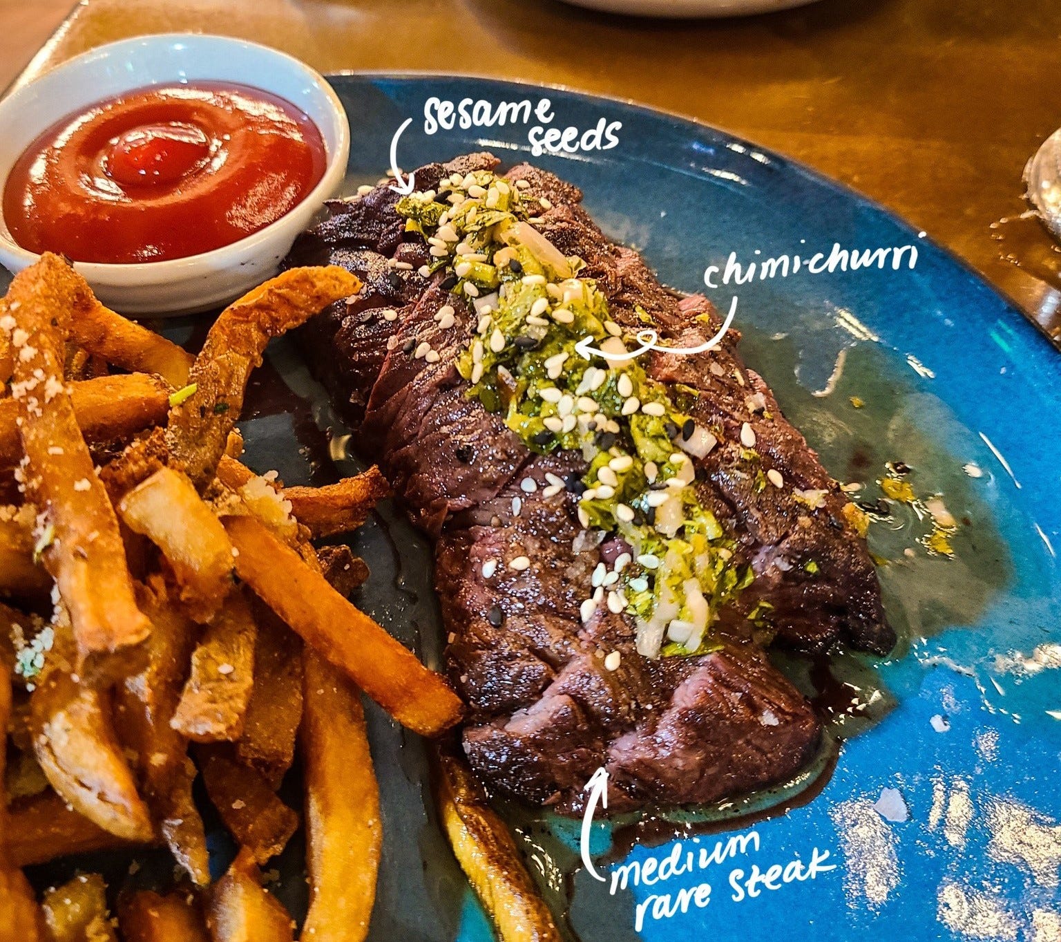 Hanger Steak: we requested medium-rare, and they DELIVERED. The steak is cooked to perfection, not a single bite was tough (think the texture of sushi-grade tuna). But it’s the chimichurri that takes the stage! WOW does it compliment the steak perfectly, bringing that extra flavor oomph. This is easily my favorite thing ordered. (rating: 10/10)
