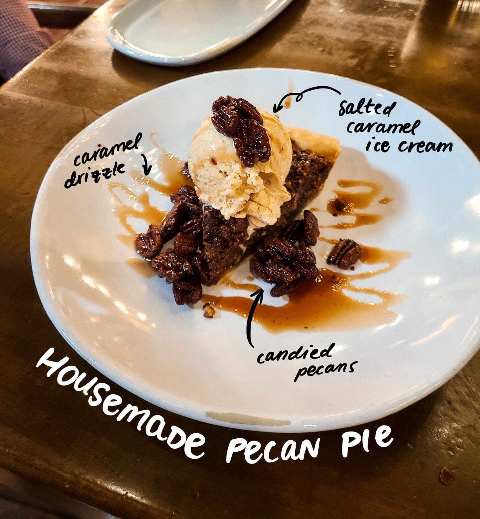 House-Made Pecan Pie: this is apparently THE thing they’re known for (winning NO. 1 Pecan Pie in Charlotte in honor of 2024 pie day). And I have to say, it was pretty good, but not something I’d want all the time as it’s too classic-American sweet for me (which covers any semblance of pecan flavor that there was). It’s on the more non-structured side of pecan pies, barely holding together, soaking up the melted ice cream on top. The garnishing of candied pecans is a lovely touch! (rating: 8.5/10)